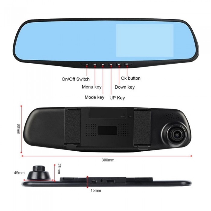 Функционален видеорегистратор огледало за автомобил, който съчетава функционалността на огледалото за обратно виждане с възможностите за запис на камера.Оборудван с 4.19-инчов ярък екран, той осигурява кристално чисти изображения както от предната, така и от задната камера, с разделителна способност съответно от 1280x720P и 640x480P/30fps. Подобрявайки цялостната видимост, включените широкоъгълни лещи (120°/90°/90°) осигуряват широко зрително поле, което ви позволява да наблюдавате всичко около вас по време на шофиране.