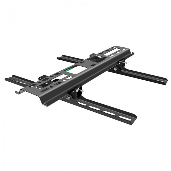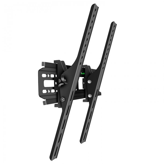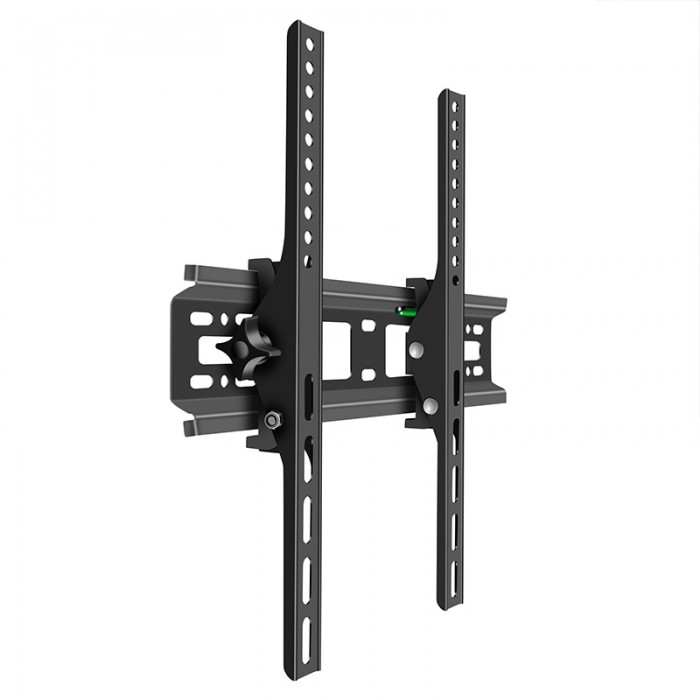 Стойка за телевизор за монтаж на стена с функция за накланяне, подходяща за екрани до 55 инча. Компактна и здрава конструкция в черен цвят, осигуряваща удобен ъгъл на гледане, лесен монтаж и стабилно закрепване.